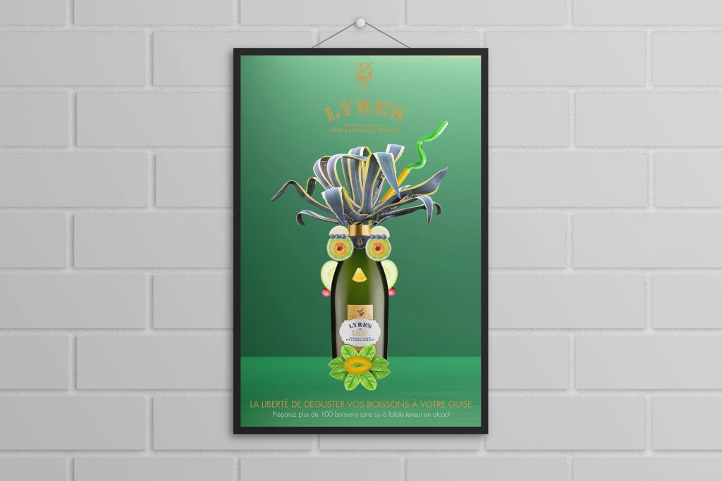 Publicité bouteille Lyre's, c'est une bouteille atypique en forme de visage avec des aliments de tous les jours - projet scolaire